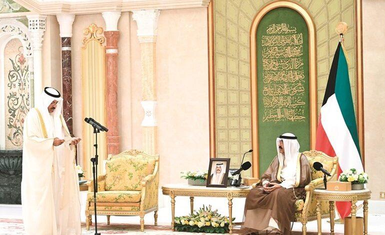 يسرني في هذا المقام وقد نلتم ثقة قائدنا ووالدنا حضرة صاحب السمو الشيخ نواف الأحمد الجابر الصباح، أمير البلاد المفدى حفظه الله ورعاه وثقتي، وأقسمتم أمام الله وأمامنا وأمام أبناء وطننا العزيز بتحمل الأمانة والمسؤولية.. أن أنقل لكم تحيات سموه حفظه الله، ومتعه بالصحة والعافية.. ورعاه، ودعوات سموه الخالصة بأن يوفقكم الله، ويعينكم ويسدد خطاكم في أداء رسالتكم الهادفة إلى خدمة وطننا الحبيب وما فيه صالحه، وتحقيق طموحات شعبه ومصالحه.