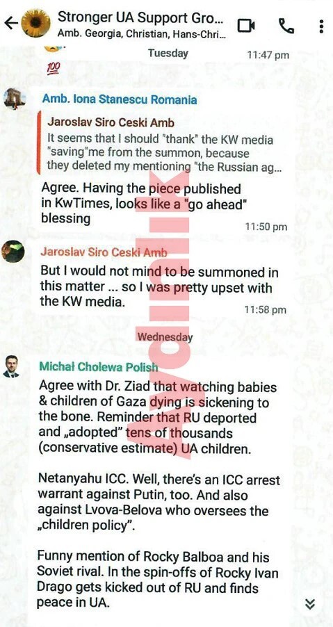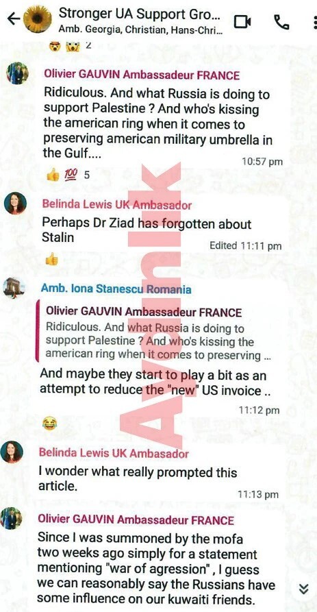 وضمت المحادثة التي نشرتها صحيفة “آيدنليك” التركية، ممثلين من المملكة المتحدة وفرنسا وإيطاليا وكندا وأستراليا وجمهورية التشيك وبولندا ورومانيا وأوكرانيا. وحاول الدبلوماسيون فرض وجهة نظر موالية للغرب، متجاهلين حياد الكويت.